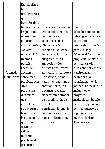 En relación a las problemáticas identificadas, se diseñaron tres propuestas institucionales para pensar la mejora de las prácticas de enseñanza. Y fueron elaboradas a partir de datos sistematizados, producto de encuestas aplicadas en distintos encuentros, Tabla 1.