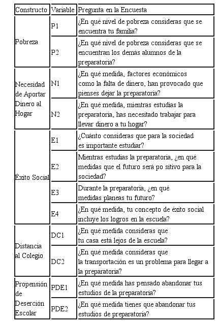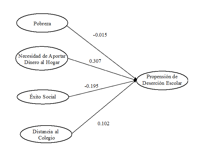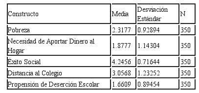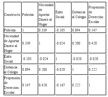 El primer constructo explicativo independiente, Pobreza, fue conformado por: a) pobreza de la familia y b) pobreza de los compañeros alumnos. Se obtuvo un nivel de fiabilidad (α) de 68% lo que para fines prácticos se pudiera considerar aceptable (George y Mallery, 2003) por lo que las variables miden un mismo constructo y están relacionadas (Welch y Comer, 1988). Para el segundo, Necesidad de Aportar Dinero al Hogar, las variables fueron: a) falta de dinero y b) trabajar para ayudar al hogar. La fiabilidad expresada fue de 65%. El tercero factor, Éxito Social, lo comprenden: a) importancia social para estudiar, b) futuro positivo para la sociedad, c) planeación del futuro y d) éxito social por logros en la escuela. Se obtuvo un α de Crombach de 70%. Por último, Distancia al Colegio, se compone de: a) distancia de la escuela y b) problemas de transportación, con fiabilidad de 70%.