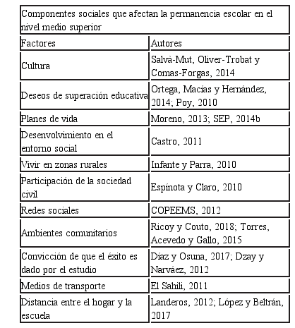 Al mismo tiempo se pueden agregar los siguientes componentes: planes de vida alineados con las necesidades generales (Moreno, 2013); la exigencia poblacional y pertinencia del estudio en el entorno (Silvera, 2016); la empatía con los demás (Juárez, 2018); el involucramiento de la sociedad civil en actividades educativas (Espínota y Claro, 2010); el grado de importancia que los medios de comunicación le dan a la preparación (Gómez y Vázquez, 2014); los niveles de influencia de grupos (Camacho, 2018); o redes sociales desincentivadas, pensar que trabajar es más importante (COPEEMS, 2012); contextos perjudiciales (Ricoy y Couto, 2018); la cultura de la meritocracia que refleja la nula necesidad de prepararse para ocupar altos puestos de trabajo (Espejo, 2012); y el rechazo social (González-Rodríguez, Vidal y Vieira, 2010).