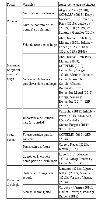 Entre otras razones, la deserción escolar se da por factores económicos que representan un peso importante (Corzo y Reyes, 2017; Miranda, 2018); muchos relacionados con aspectos de pobreza (Secretaría de Educación Pública [SEP], 2008); falta de dinero para alimentación suficiente o ningún acceso a crédito para cuotas escolares (Landeros, 2012); escaso recurso para el transporte (Cardoso y Verner, 2011); marginación, temprana vinculación laboral (Ortega et al., 2014); exclusión económica (Espinoza, Castillo, González y Loyola, 2014); bretes laborales de los padres (Salvà-Mut et al., 2014); insuficiente dinero en el hogar (Antelm, Gil-López y Cacheiro-González, 2015); necesidad de trabajar, por parte de los estudiantes, para apoyar en la casa (Infante y Parra, 2010; Martínez-Sánchez et al., 2013); invertir tiempo en buscar empleo (Gómez-Restrepo, Padilla y Rincón, 2016); pertenecer a niveles socioeconómicos bajos, que solo uno de los padres trabaje (Vera, 2012); baja retribución laboral de la madre o el muy elevado ingreso del padre (Martín et al., 2015); pocas posibilidades de insertarse en la vida laboral finalizando los estudios (Romero y Hernández, 2019); el contexto económico que reproduce la propia escuela ante el déficit de infraestructura y equipamiento y la pobre imagen que refleja (Vargas y Valadez, 2016); que los alumnos no cuenten con artículos escolares como útiles o computadoras (El Sahili, 2011) o cual- quier problema financiero que no permita hacer frente a los gastos que requiere el buen desempeño académico como, por ejemplo, la falta de dinero para acceder a Internet (Camacho, 2018).