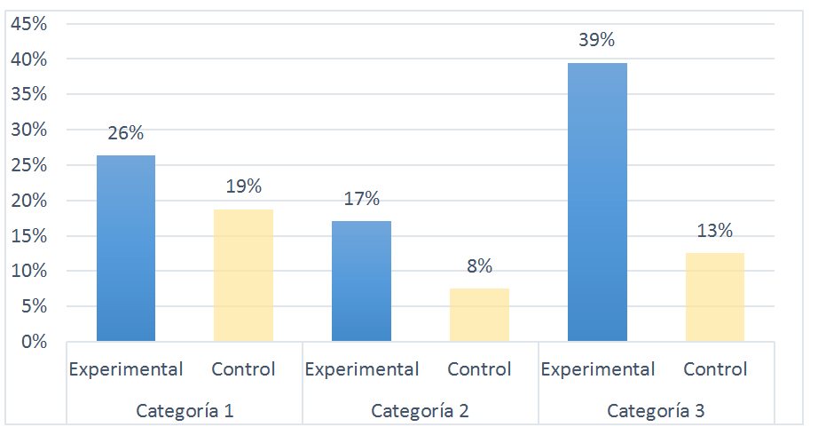 Por su parte, el grupo control no tuvo incremento significativo en la comparación del porcentaje de palabras evocadas por categorías semánticas del pre y post-test (valor-p=.6655 categoría 1, valor-p=1 categoría 2, valor-p= .6078 categoría 3).