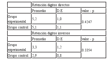 Aplicado el test de Wilcoxon para comparar a los dos grupos en la amplitud de dígitos, no mostró diferencias significativas (véase Tabla 1).