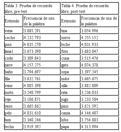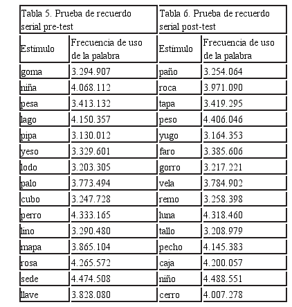 En la elaboración de las pruebas se siguió la metodología básica de la tarea, a saber, se presentó una lista de vocablos al participante para su posterior recuerdo en el orden deseado (Grenfell-Essam, Ward y Tan, 2017). Se cauteló que las listas del pre y post-test fueran similares en longitud, número de sílabas por palabra y rangos de frecuencia de uso de las palabras. Para seleccionar los estímulos de las listas se utilizó el Spanish Lexical Database (Espal) y se usó el valor logaritmo 10 (cnt +1). La longitud de cada lista de recuerdo libre fue de 15 vocablos (Grenfell-Essam y Ward, 2012), todos sustantivos bisilábicos [c-v-c-v] (Golomb et al., 2008; Baker, Tehan y Tehan, 2012), divididos en 9 de baja frecuencia y 6 de alta frecuencia de uso. El rango de baja frecuencia fue desde 3.054.996 hasta 3.794.697 de palabras y el rango de alta frecuencia fue desde 3.882.809 hasta 4.313.994 de palabras (véanse Tablas 3 y 4).