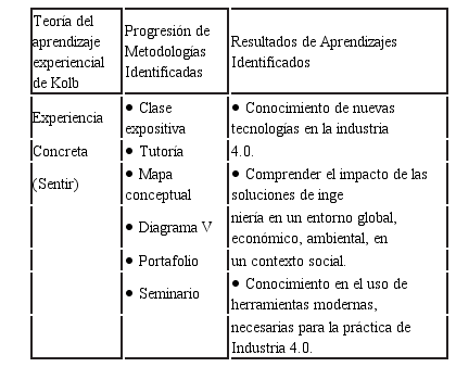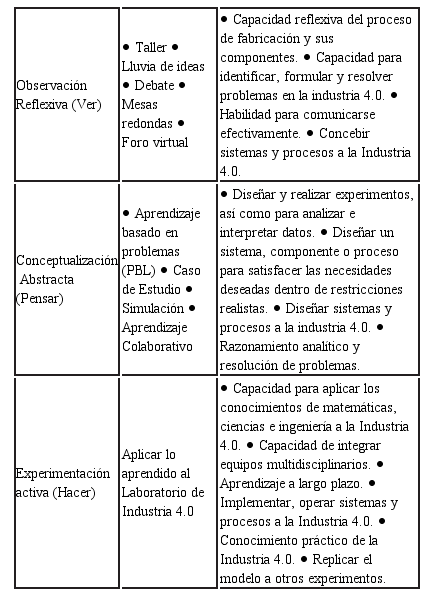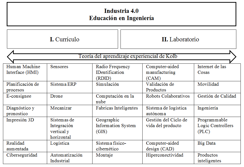 En esta investigación cualitativa se propuso un marco genérico para la educación de la Industria 4.0, que consiste en implementar componentes al currículo y al laboratorio, para ajustar la educación de ingeniería a la visión de la Industria 4.0. En el componente del currículo, se determinó la relación que existe entre los distintos programas de ingeniería en la universidad de estudio, que vinculan la Industria 4.0 en sus planes de estudio. En el siguiente paso, se aborda cómo debería plantearse un laboratorio adaptado a la Industria 4.0, utilizando la Teoría del aprendizaje experiencial de Kolb, siendo de gran importancia para ajustar la educación en ingeniería a la visión de la Industria 4.0, empleando además metodologías de enseñanza-aprendizaje, con el fin de mejorar la experiencia concreta (sentir), la observación reflexiva (ver), la conceptualización abstracta (pensar), y la experimentación activa (hacer), y así preparar al estudiante desde lo teórico a lo práctico y desarrollando tanto habilidades interpersonales como profesionales.
