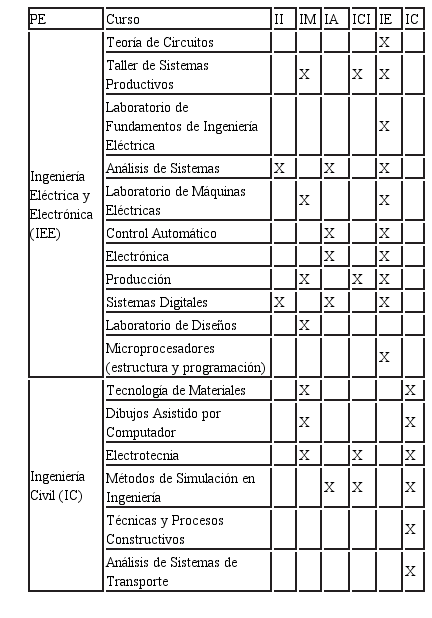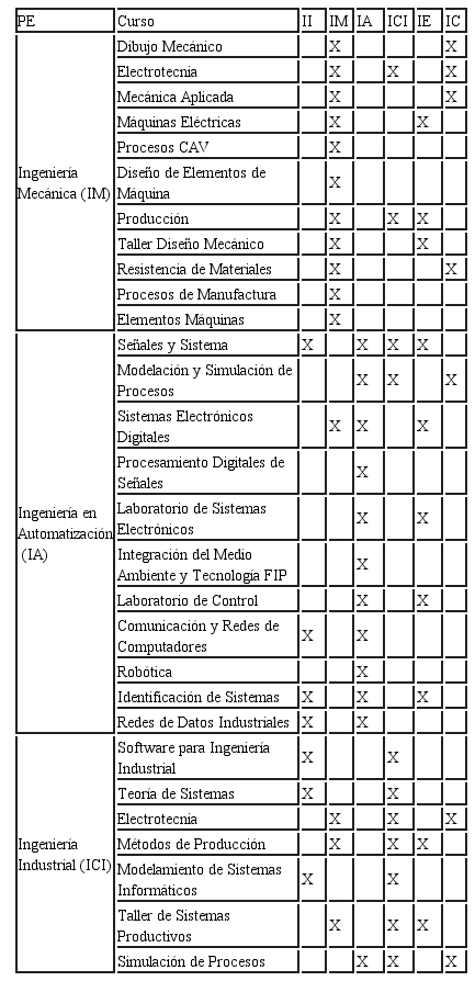En la Tabla 1 se enumeran los cursos impartidos en la universidad seleccionada, que están relacionados con la Industria 4.0, o que están sujetos a cambios para adaptarse a los requisitos de la Industria 4.0 - en función de los objetivos, contenidos, resultados de aprendizaje, tecnologías y herramientas usadas en clases y en los laboratorios. La tabla incluye datos sobre seis Programas de Estudio (PE) de ingeniería que se relacionan con los cursos en la Tabla 1.