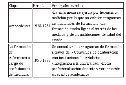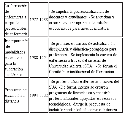 En el contexto que aquí nos ocupa, como resultado del análisis histórico documental, se identificaron cinco etapas (Tabla 1): Antecedentes (1928-1951); formación a cargo de profesionales de medicina (1951-1977); formación a cargo de profesionales de enfermería (1977-1988); nuevas modalidades educativas (1988-1994); programas de educación a distancia (1994-2003), en las que se devela una constante búsqueda y construcción de la identidad profesional así como el papel que jugó la educación a distancia en este proceso (Hernández, del-Gallego, Alcaraz y González, 1997).