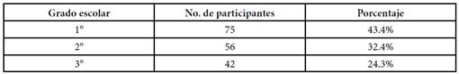 En el estudio participaron voluntariamente 173 alumnos de telesecundaria de primer, segundo y tercer grado del estado de Michoacán. Las edades de los participantes oscilaron entre 12 y 17 años (Media=13.43; DE=1.10), de los cuales 86 (49.7%) de los participantes fueron del sexo masculino y 87 (50.3%) del femenino. (ver Tabla 1)