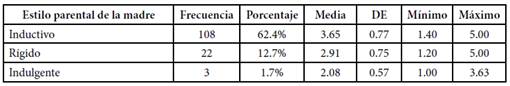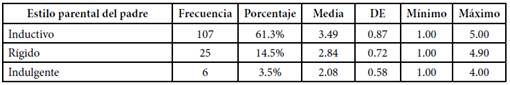 En relación con los resultados obtenidos, los alumnos perciben en el padre que el estilo parental que utilizan con mayor frecuencia es el inductivo (o democrático), con un porcentaje de 61.3% (ver Tabla 2). De acuerdo con los porcentajes de los estilos parentales con respecto a la madre, la preferencia también se inclina hacia el inductivo con un porcentaje de 62.4%, siendo el estilo parental indulgente (o permisivo) el de menor frecuencia en ambos casos (ver Tabla 3).