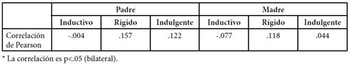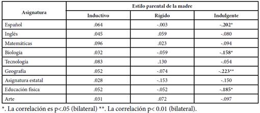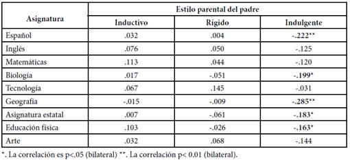 Respecto a las correlaciones de Pearson entre el estilo parental del padre percibido por parte del hijo varón con las calificaciones de éste, se observaron correlaciones negativas y significativas entre el estilo indulgente y las calificaciones de las materias de español, geografía, biología, asignatura estatal y educación física, siendo las de español y la de geografía las de mayor nivel de significación. Por otro lado, no se observaron relaciones significativas entre los estilos inductivo y rígido con ninguna de las materias (ver Tabla 4).