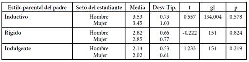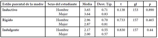 En relación a las posibles diferencias respecto al sexo en el estilo parental del padre y de la madre, no se encontró ninguna diferencia significativa (ver Tablas 6 y 7).