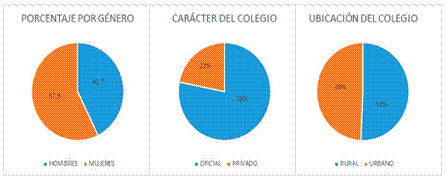 Del total de la población estudiada un 57,3% corresponde a mujeres y un 42,7% a hombres, observándose que la mayoría se encuentran estudiando en los colegios oficiales (ver Figura 1). Del total de estudiantes encuestados, el 49% se encuentran en Instituciones urbanas y el 51% en Instituciones rurales del Municipio de Lebrija.