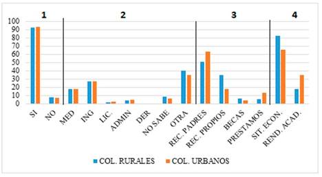 Seguidamente, se proporcionan los resultados de 4 variables trabajadas. En la figura 2, se muestran las características que pueden intervenir en el ingreso a la Universidad de los colegios urbanos y rurales del Municipio de Lebrija, entre ellas: intención de continuar estudiando (1), carreras seleccionadas (2), fuente de recursos económicos (3), posibles barreras para ingreso a la educación superior (4).