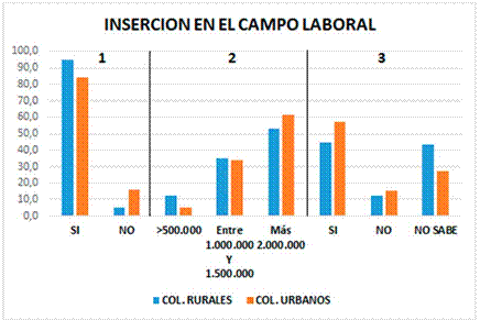 La segunda variable analizada en esta gráfica (parte 2), muestra las aspiraciones salariales de los futuros bachilleres, destacando que los jóvenes de ambos contextos esperan un buen salario, pues 52,7% rural y 61,3% urbano aspiran a ingresos superiores a dos salarios mínimos legales vigentes colombianos. Este resultado se esperaba, ya que los jóvenes consideran que algunas profesiones tienen estatus social y, muchos esperan llegar a tener empleos exitosos y bien remunerados.