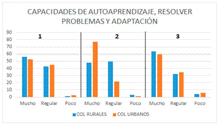 En la habilidad para solucionar problemas (parte 2 de la figura 4), si hay que tener en cuenta las diferencias entre las respuestas de los estudiantes de ambos contextos, donde los jóvenes rurales muestran deficiencia en esta competencia, al responder mucho el 48% y un 49% regular, es decir cree que casi es capaz de llegar a realizar esta actividad. Los ubicados en entorno urbano respondieron mucho 77%, regular 22% y poco 1%.