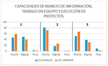 En cuanto a la capacidad para manejar información, la opción mucho tuvo en promedio un 52,9% y la opción regular un 44,7%, tan sólo un 2,4% manifiesta poca capacidad (parte 1 de la figura 5). De todas las habilidades estudiadas, la capacidad para trabajar en equipo (parte 2 de la figura 5) dio resultados favorables al observarse que un 81,5% de los rurales y un 72,5% de los urbanos considera tener esta destreza, esta respuesta sugiere que se pueden aplicar estrategias de trabajo colaborativo en el aula de clase, aunque el docente debe verificar que el trabajo en equipo realmente funcione, de lo contrario sucederá que solo algunos son los que trabajan y otros permanecen sin lograrlo.
