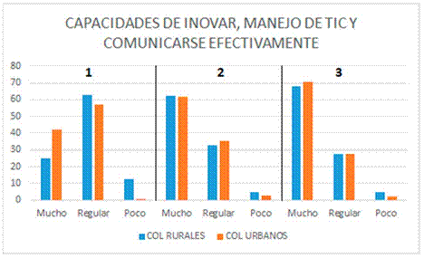 De las competencias, la capacidad para innovar procesos, muestra debilidad, en los datos globales en la opción mucho (33%) y regular (60%). Esto es debido al modelo pedagógico que se está implementando, en el que se asume un proceso de enseñanza aprendizaje más enfocado en los conceptos que en la parte actitudinal y procedimental. Por otra parte, en las competencias comunicativas un 69% dice tener alta esta habilidad.