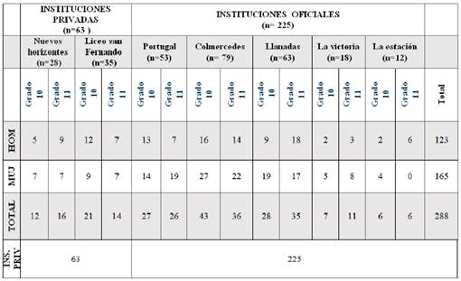 La selección de la muestra se hizo de manera aleatoria. En total se encuestaron 288 estudiantes entre las 7 Instituciones Educativas. Las edades fluctuaban de 14 a 18 años.