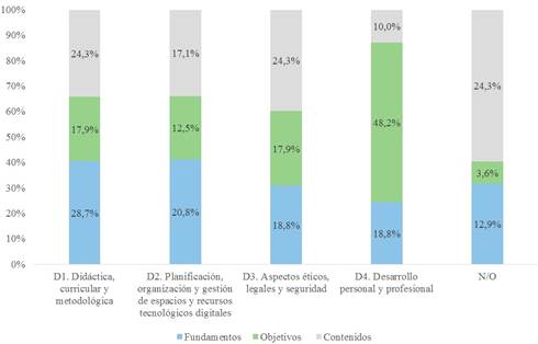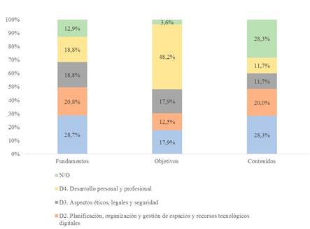 Al analizar (Figura 1), podemos ver que, las D1 Didáctica, curricular y metodológico y D2 Planificación, organización y gestión de espacios y recursos tecnológicos digitales presentan mayor presencia en los fundamentos -51,8% y 52,5% respectivamente- y menor cobertura en los objetivos (17,9% y 17,5%). Mientras que D3 Aspectos éticos, legales y seguridad reporta su mayor cobertura a nivel de fundamentos (52,8%) y menor cobertura en los contenidos, con solo un 19,4%. La dimensión D4 Desarrollo personal y profesional, presenta la mayor cobertura curricular en el componente de objetivos o resultados de aprendizaje (50,9%), y escasa cobertura curricular en los contenidos (13,2%). Las UR que no se asocian a ninguna dimensión de la CDD corresponden, en su mayoría, en los contenidos (53,1%).