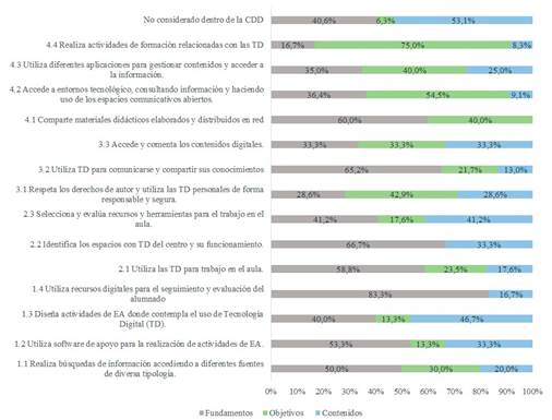 En el ámbito micro curricular, se analizó la cobertura en las dimensiones de la CDD en los programas de las asignaturas de TIC en FID en universidades públicas en Chile, a través de la presencia de las dimensiones de las CDD en los tres componentes compartidos por los programas de las asignaturas de TIC en FID: fundamentos, objetivos o resultados de aprendizaje y contenidos. Se analizaron 217 unidades de registro (UR), de ellas, el 46,5% (101 UR) correspondían a la unidad de muestreo Fundamentos, el 25,8% (56 UR), a objetivos y un 27,6% (60 UR) a contenidos.