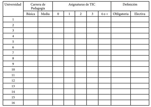 El análisis macro-curricular se realizó a través del análisis documental de los planes de estudio y mallas curriculares de las 64 carreras de pedagogía del país. Para ello, se utilizó una matriz de análisis de contenido en la que se registró: la universidad, el tipo de carrera, la cantidad de asignaturas de TIC y su definición como asignatura(s) obligatoria(s) o electiva(s).