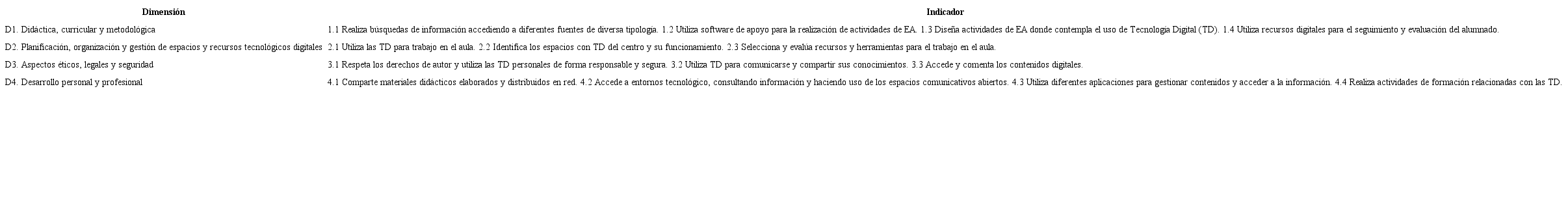 En el contexto de una investigación que buscaba medir a través de un instrumento de evaluación la CDD en estudiantes de FID en Chile y Uruguay, (Silva et al., 2016), se generó y validó una matriz de indicadores para evaluar la CDD en FID. La matriz (Tabla 1) considera 14 indicadores, organizados en cuatro dimensiones.