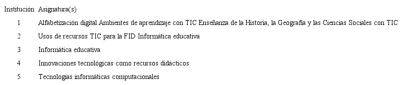 Se observa un número pequeño de planes de formación en FID, en el que se muestra un cierto grado de progresión de la formación en TIC de los futuros docentes. En estos casos, el plan de estudios ofrece dos o tres asignaturas de TIC. Una asignatura general, ubicada en el primer ciclo formativo, asociada a alfabetización digital; una segunda asignatura, durante el segundo ciclo formativo, focalizada en el desarrollo de ambientes de aprendizajes mediados por TIC; y finalmente, en el último ciclo de formación, se incorpora una asignatura de TIC relacionado a lo didácticodisciplinar, como, por ejemplo, la asignatura “Enseñanza de la Historia, la Geografía y las Cencías Sociales con TIC”. Este modelo es observado en 3, de las 16 universidades públicas analizadas.