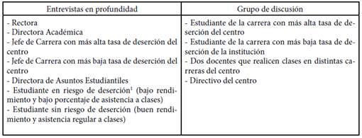 El caso objeto de este estudio corresponde a un Centro de Formación Técnica chileno, que imparte clases en modalidad presencial en régimen diurno y vespertino, accesible geográficamente y que expresó interés por participar en la investigación. Además, se consideró necesario que estuviera acreditado, de tal forma de asegurar que el centro desarrollara un mínimo de procesos que pudieran ser referidos y observados por los participantes. En relación con estos últimos, se consideró una muestra intencional, tipo muestreo no probabilístico, seleccionando aquellos informantes clave que pudiesen aportar información relevante sobre el objeto de estudio (Latorre, Rincón, y Arnal, 2003; Sierra Bravo, 2003) y que manifestasen disposición al diálogo y a compartir sus experiencias. Por tanto, a fin de contar con una diversidad de perspectivas y miradas en torno a la temática, este estudió consideró una muestra heterogénea conformada por directivos, docentes y estudiantes, tal como se puede observar en la Tabla 1: