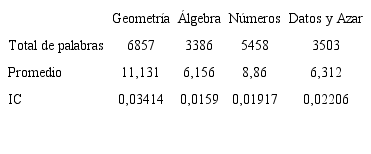 Así, se puede observar que los resultados son congruentes con otros estudios a nivel nacional en niveles educativos similares, tanto en las características del Lexicón matemático como de los índices de disponibilidad léxica en cada uno de los ejes examinados (Ferreira et al., 2014; Salcedo y Del Valle, 2013). Del mismo modo, los antecedentes reflejan que el mayor número de palabras promedio aparece asociado al eje de Geometría y el menor a Datos y Azar, lo que resulta coincidente con el estudio de Salcedo y Del Valle (2013). Se puede inferir que probablemente aquellos estudiantes que tienen un mayor interés y mejores desempeños académicos en matemática, probablemente alcanzan mayores promedios de palabras disponibles para cada eje, tal como lo demuestra la comparación de promedios generados en estudiantes de Ingeniería de nivel universitario, los cuales, para los mismos dominios examinados, muestran promedios superiores, pero igualmente consistentes en proporción por ejes, o bien al examinar los promedios de estudiantes de nivel básico con nivel medio (Cerda et al., 2017; Urzúa et al., 2006).
