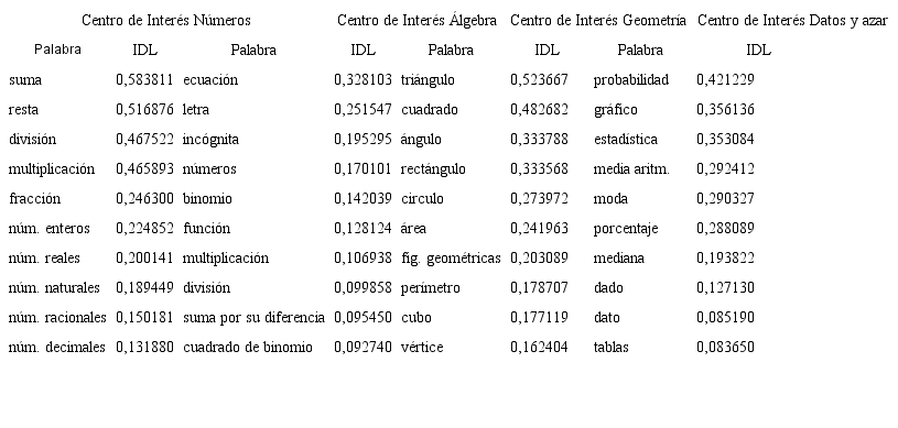 Al observar los resultados, resulta evidente que en el centro de interés Números, las cuatro palabras con mayor IDL se relacionan con las 4 operaciones básicas, lo que da a entender que, al mencionar números a los estudiantes, éstos entienden en que hay que operarlos entre sí. No sucede lo mismo en Álgebra, pues la palabra con mayor IDL (ecuación) tiene un valor asociado incluso menor que la cuarta palabra evocada en el centro de interés Números. En geometría prima la evocación de las figuras geométricas básicas, mientras que en el centro de interés Datos y Azar emergen principalmente conceptos asociados con estadística descriptiva.