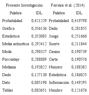 A partir de las respuestas dadas por los estudiantes, se configura el Índice de Disponibilidad Léxica (IDL), el cual busca reflejar la disponibilidad de una palabra que posee un grupo de personas en un determinado centro en interés. Para poder asignar dicho índice se consideró la fórmula utilizada por Echeverría (1991) la que considera el grado de disponibilidad de la palabra sobre la base del lugar en que dicha palabra se encuentra en la encuesta. Para ello, la fórmula cuenta con un factor de relevancia que decrece a medida que la posición de la palabra aumenta. En este caso, dicho factor numérico es una potencia de base λ con λ<1, cuyo exponente es la posición disminuida en 1 unidad. Para efectos de este estudio se ha considerado el valor λ=0,9, de acuerdo a los lineamientos de Valenzuela, Pérez, Bustos y Salcedo (2018).