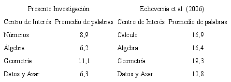 También ha parecido pertinente contrastar los resultados de la investigación con otro estudio, relacionado con los mismos centros de interés, pero relacionados con estudiantes que ingresaron a una carrera de corte científico, específicamente, la carrera de pregrado de Ingeniería Civil Matemática, resultados que fueron reportados en el estudio de Echeverría et al. (2006). Al comparar los promedios de palabras de cada centro de interés de esta investigación, con los promedios de palabras que presenta la investigación con los estudiantes de dicho estudio, se evidencian, como es de esperar, naturales diferencias en la cantidad de palabras en favor de los estudiantes universitarios. No obstante, la evidente diferencia en los promedios de palabras, se constata que la proporción de los promedios de palabras entre los centros de interés guarda una proporción similar, y en ambos casos, el eje de Datos y Azar es el que recibe menor cantidad de palabras, como se aprecia en la Tabla 5: