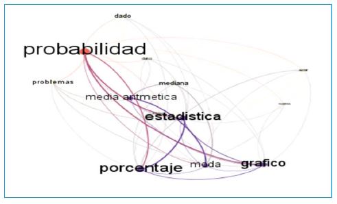 Un hecho interesante de observar en el centro de interés de Datos y Azar, es que muestra un IDL levemente mayor en la primera palabra “probabilidad”, aunque luego, al comparar las 10 palabras con mayor IDL, se constatan diferencias en la profundidad conceptual de las palabras (véase Tabla 3). Del mismo modo, mediante la teoría de los grafos, se pueden visualizar las diversas conexiones entre las palabras y sus relaciones de importancia dadas por la recurrencia de las mismas. Estos grafos describen de forma visual las redes semánticas que se configuran a partir de las palabras y el orden de prelación en la cual ellas son señaladas por los estudiantes como conceptos asociados al centro de interés examinado. Así en un grafo pueden existir diversos nodos, que pueden estar asociados o ser independientes, y el grosor de las líneas de conexión deja entrever la mayor o menor recurrencia en la conexión desprendida de los datos analizados. Así, el concepto de probabilidad emerge como un nodo principal de la estructura de una red semántica que conecta dicho concepto con otros como estadística o porcentaje, tal como se visualiza en la Figura 1. Igualmente, se puede observar también en la Tabla 3, que solo existe una palabra (dado) que es más bien, un medio de contextualización en este centro de interés que un concepto matemático que es relevante para construir futuras redes semánticas.