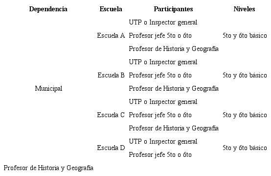 En la población se consideró el mundo adulto vinculado a las escuelas públicas céntricas de la capital regional de Ñuble (Chillán), siendo considerado los niveles de 5to y 6to básico debido al énfasis curricular en la formación ciudadana tanto en la asignatura de Historia y Geografía como de manera trasversal. Los sujetos seleccionados responden a los siguientes criterios: profesor jefe, profesor de historia y el jefe (a) de UTP o Inspector General como parte del equipo directivo (ver Tabla 1). Tomando en cuenta las cuatro escuelas ya mencionadas se realizaron en total doce entrevistas de tipo semiestructurada que cubrieron en su totalidad el punto de saturación de los discursos de los sujetos.