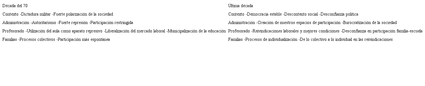 La evolución de la participación en nuestro país durante las últimas décadas ha estado marcada por elementos históricos que condicionan a la sociedad (ver Tabla 2). La década del setenta en Chile fue un periodo de autoritarismo, destacando la participación en forma de reivindicación, en la actualidad la sociedad chilena emerge como una especie de relativa calma, pero que se vio interrumpida durante estos últimos meses y que se ha traducido en desconfianza a la clase política.