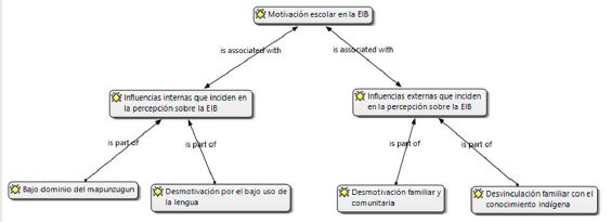 Del análisis de las entrevistas grupales realizadas a los estudiantes sobre la implementación de la EIB, emerge una categoría central denominada Motivación escolar sobre el conocimiento y uso de la lengua y cultura mapuche en la EIB. De dicha categoría central emergen dos subcategorías asociadas a las influencias internas y externas que inciden en el aprendizaje de la lengua y la cultura mapuche en el marco de la EIB. La categoría central, las subcategorías y sus códigos se presentan en la siguiente figura.