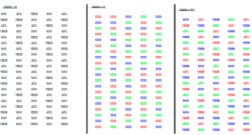 El Test de Stroop consta de tres pruebas. La primera prueba consiste en lectura de palabras (Stroop-P), en donde el estudiante lee durante 45 segundos los nombres de los colores rojo, verde y azul, impresos en tinta negra. La segunda prueba es la mención de colores (Stroop-C) y se compone de filas de X impresas en colores diferentes, en 45 segundos el estudiante menciona los colores de X hasta donde le sea posible. La tercera prueba es de color-palabra (Stroop-PC), ésta contiene las palabras escritas rojo, verde y azul, que al mismo tiempo están impresas en colores distintos a la palabra escrita. En 45 segundos el sujeto debe mencionar el color en que está impresa la palabra, en tanto que inhibe la lectura. A continuación, en la Figura 1 se pueden observar las láminas que componen cada una de estas tres pruebas que en su conjunto, componen el Test de Stroop.
