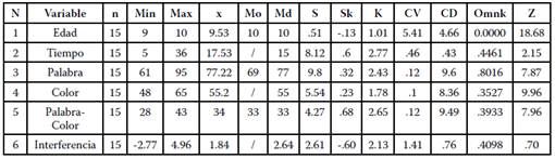 Aún más, debe precisarse que los coeficientes de variación y de dispersión de esta variable denotan la existencia de un solo grupo de resultados (CV, CD > 0.00 y CV, CD < 1.5) y por lo tanto, homogeneidad en los resultados de los sujetos respecto al nivel de interferencia obtenido en la prueba.
