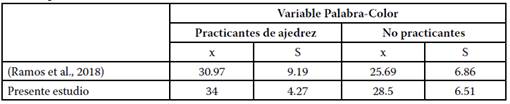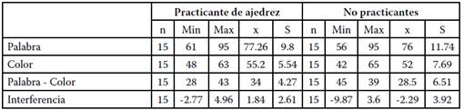 A continuación, en la Tabla 3 se presentan los resultados del Test Stroop en el grupo de alumnos practicantes de ajedrez: