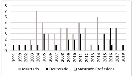 Observou-se que a maior concentração de pesquisas nos seguintes anos: 2004 com 8 pesquisas (7 dissertações e 1 tese); 2005 e 2011, 8 pesquisas cada (5 dissertações e 3 teses); 2017 também com 8 pesquisas (4 dissertações e 4 teses). Os anos de 2014 e 2016 com 7 pesquisas; 2015 e 2009, com 6 pesquisas cada; 2010 com 5 pesquisas; 2007, 2008, 2012, cada um com 4 pesquisas; 2003 e 2006, com 3; 1999 e 2002 com 2 pesquisas; 1991 e 2013 com o menor número 1 pesquisa cada ano. Os anos que resultaram em maior número de dissertações foram: 2004 (com 7 pesquisas); 2014 (com 6 pesquisas); 2005 e 2011 (com 5 pesquisas cada ano). Já as teses foram publicadas em 2016 e 2017, com 4 pesquisas cada ano.