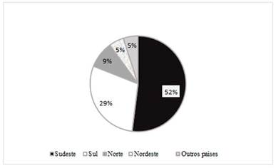 Também constatou-se nas análises das teses e dissertações, constatou-se que a região Sudeste tem o maior número de produções, 42%, seguida da região Nordeste com 29%; já a região Centro-Oeste soma 19% das produções e a região Sul com 9%; por fim a região Norte com 1% de trabalhos na área. Uma conjectura para a região Sudeste apresentar elevada quantidade de produções acadêmicas relacionadas à profissionalização do professor é que, segundo dados da Capes (2017), esta região abrange o maior número de programas de pós-graduação em Educação (PPGE), de modo que em 2017, havia 69 PPGE, representando 40,6%. A região Nordeste, por seu turno, apresenta 32 PPGE (18,8%); a região Sul 42 PPGE (24,7%); a região Centro-Oeste possui 16 PPGE (9,4%); a região Norte conta com 11 PPGE (6,4%). A discrepância entre a quantidade de PPGE da região Sudeste (69) e da região Norte (11) é elevada, justificando-se como hipótese para a região Sudeste publicar mais teses e dissertações sobre o tema profissionalização do professor, do que a região Norte.
