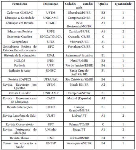 Com o intuito de evidenciar as fontes que denotam a profissionalização do professor, na tabela 6, apresentam-se os nomes das revistas em ordem alfabética, as instituições que estão vinculadas, a avaliação do “Qualis Periódicos” conforme a plataforma Sucupira e a quantidade de publicações sobre o tema proposto. Importante enfatizar que o Qualis Periódicos é um sistema de Coleta de dados utilizado para classificar a produção científica de pós-graduação (CAPES, 2019a). A classificação dos periódicos é realizada pelas áreas de avaliação e passa por processo anual de atualização, sendo estes enquadrados em estratos indicativos de qualidade: A1 o mais elevado; A2; B1; B2; B3; B4; B5; C, com peso zero (CAPES, 2019b).