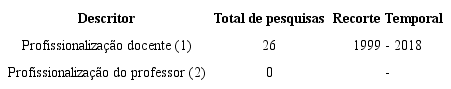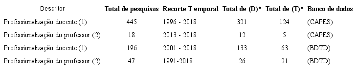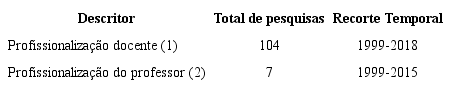 Nas ferramentas de pesquisa, incialmente, utilizou-se como descritores: (1) “profissionalização docente” e em seguida (2) “profissionalização do professor”, sendo selecionado como área do conhecimento o campo que se refere à Educação. Mediante a busca, os seguintes dados foram alcançados: