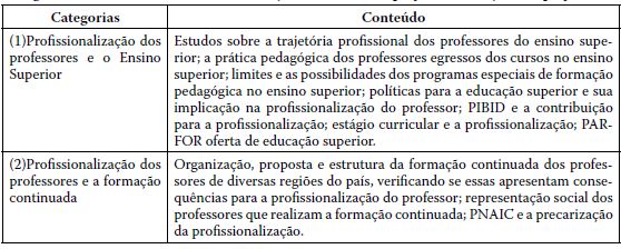 Considera-se que o conteúdo é um fator relevante para categorização no Estado da Arte da temática profissionalização de professores, “[...] pois é ele que refina o tema e aponta maior rigorosidade ao trabalho” (Raimundo e Fagundes, 2018, p. 19). Esse mapeamento permitiu situar, no âmbito das produções científicas, os subtemas já desenvolvidos sobre a profissionalização do professor.