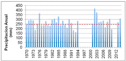 El análisis del histograma de precipitaciones (Figura 2) permite visualizar rápidamente que aquellos años que superan la media de 247 mm corresponden a años húmedos (2002, 417mm; 2003, 375 mm y 1976, 365 mm); y los años secos son aquellos que quedan por debajo de la media (1993, 163 mm; 1992, 181 mm y 1974, 188 mm). El período 1970-2014 muestra un predominio de años húmedos. Del total de datos analizados, casi el 80 % presenta un comportamiento normal, y el resto corresponde a variaciones que superaron un desvío siempre en sentido positivo.