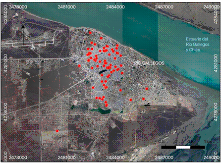 La ciudad se implanta aproximadamente a 15 m.s.n.m, en el estuario del río Gallegos (Figura 1) con márgenes asimétricos, con una margen N acantilada y paisaje de meseta y la margen S baja, modelada por procesos fluvioglaciales. La región presenta un clima templado frío - semiárido de meseta y se caracteriza por vientos predominantes del sector oeste-sudoeste y una velocidad promedio de 35 km/h con ráfagas que alcanzan los 100km/h entre los meses de octubre y marzo y precipitaciones medias que no superan los 240 mm anuales (Diez, 2017; Soto y Vázquez, 2000). El paisaje resultante de este tipo climático se corresponde con vegetación achaparrada xérica, aparentemente de baja biodiversidad.