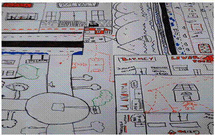 Podríamos decir que los estudiantes recorrieron y trazaron su territorio, mostrando sus pasiones, fantasías y relatos. El mapa fue una herramienta que materializó dichos deseos y percepciones marcando los límites conocidos por ellos. Pudieron darle forma al territorio atravesado por el tiempo con sus variables sociales, económicas, históricas que envuelven a cada uno de los participantes de esta experiencia didáctica con una mirada particular desde su cotidianidad, cargada de sensaciones y sentimientos llenos de historia.