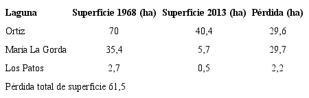 Los docentes guiaron la lectura, interpretación y digitalización de la fotografía indicando observar la dimensión y forma de las lagunas, marisma, la línea de costa y el sistema hídrico natural relacionado a antiguos canales de marea, se establecieron diferencias con la forma y tamaño de la mancha urbana actual. Con el fin de exponer las diferencias se presentó una tabla de pérdida de superficie de las tres lagunas que alcanza un total de 61,5 ha (Tabla 1) calculada a partir de las diferencias entre el mosaico aerofotográfico del año 1968 y la imagen satelital de alta resolución del año 2013 y 35,2 ha de canales de marea de los cuales no quedan evidencias en la morfología actual. También se pudo observar que las lagunas se encuentran fragmentadas y geometrizadas por vías de circulación que alteran el flujo de desagüe natural con el consecuente desecamiento del sector más bajo y la inundación de las calles aledañas (Diez, Vázquez y Ruiz, 2015).