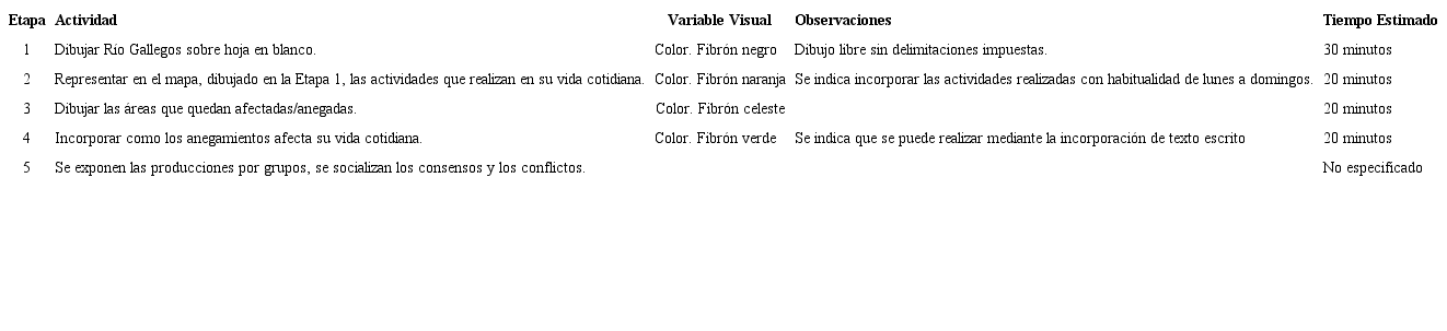 La metodología del taller consistió en armar grupos de 5 integrantes organizados por afinidad. La intención fue aprovechar la complicidad de “amigos” para romper con la timidez y/o vergüenza para dibujar. Con el fin de no condicionar el mapa mental, individual y colectivo, se trabajó sobre hojas de papel afiche en blanco (Figura 5). La Tabla 2, muestra la planificación del taller a partir del objetivo cartografiable: