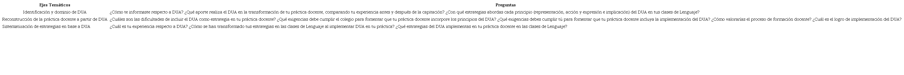 En una segunda instancia, se realizaron entrevistas semiestructuradas a cada profesora para complementar la observación de la práctica con el discurso docente, desplegando a partir de ahí elementos relevantes para el análisis de la información. Las entrevistas se organizaron mediante un guion temático, compuesto por preguntas orientadoras formuladas para conocer conceptos, experiencias, transformaciones de prácticas, ejemplos, potencialidades y dificultades respecto a DUA.