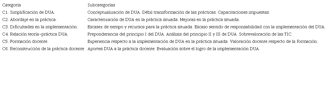 La categoría C4. “Relación teoría-práctica DUA”, permite realizar una caracterización de lo ejecutado y comprendido por las docentes respecto a DUA en su práctica. Refiriéndose al contexto y a las condiciones para implementar DUA, las participantes señalaron: